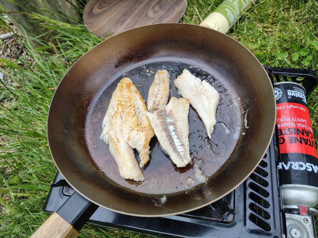 Místo kapra jsem si opekl, o poznání chutnějšího, vojáka pacifiku (gurnard). Spolu s bramborovým salátem, kterej obsahoval opečenou slaninu a brambory nakrájený na úctyhodný kusy, jak od táborový služby vlčat a zraněných.