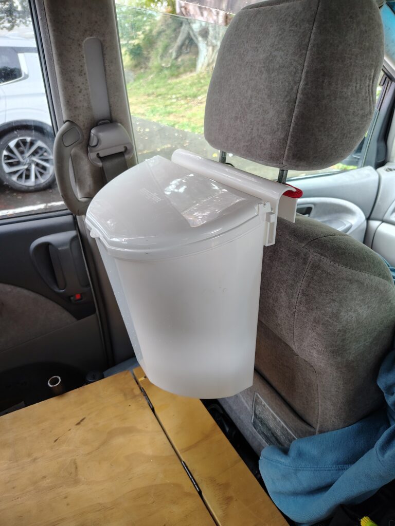 Takže po projetí asi 3 různých obchodů jsem měl vše – kit na přichycení hajzlu, mřížku na zakrytí odvětrávání nádrží s vodou, a roztomilý odpadkový koš.
